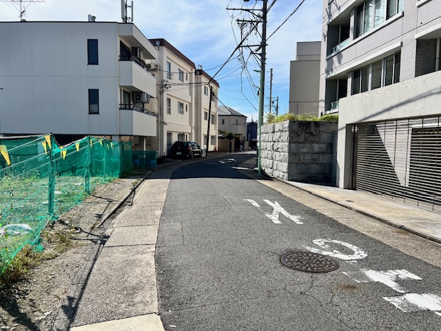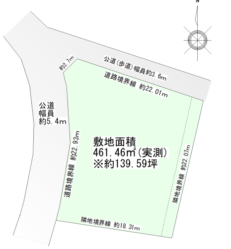 方位 | 西側公道(幅員約5.4m)に約22.9m接道・北側公道(幅員約3.6m)歩道階段に約22m接道の角地 |
